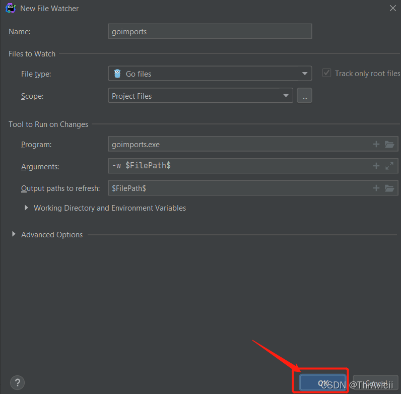 - File Watchers 的配置会使在每次保存时会自动运行一个格式化命令,此处点击 “+”,添加 “goimports”