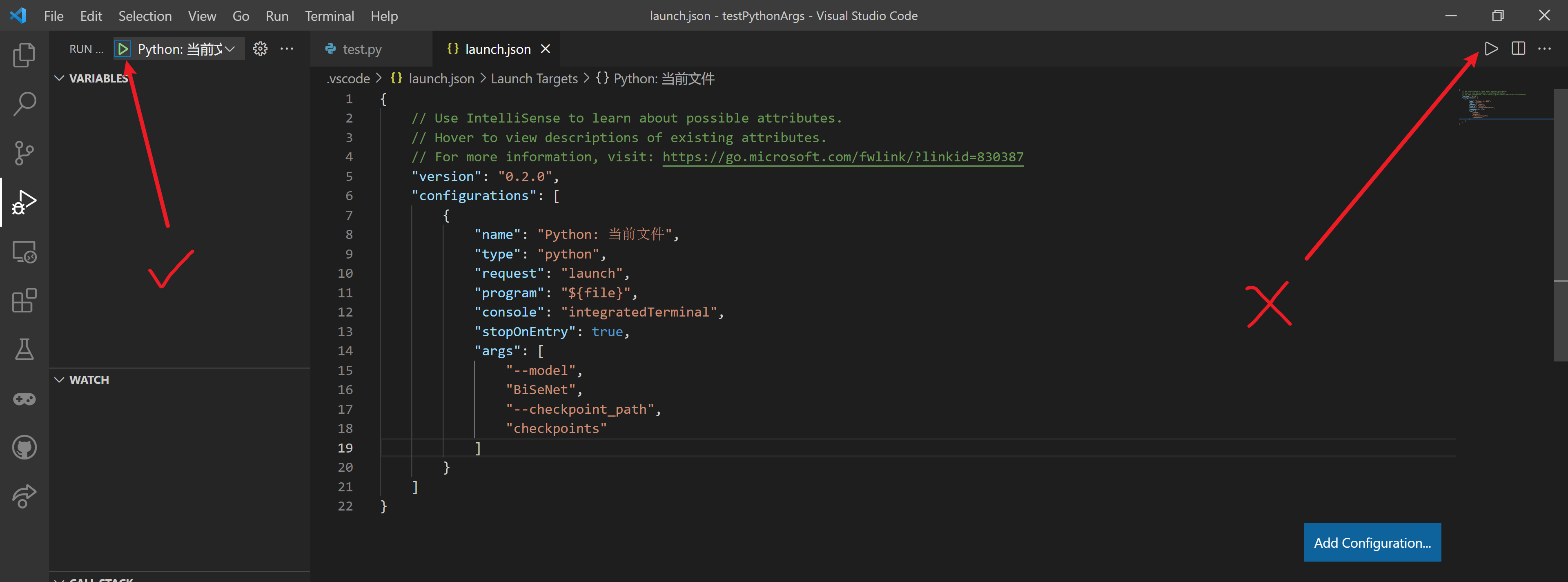 下面就是通过 VS Code 传入参数 '--model' 和 '--checkpoint_path',方法如下: