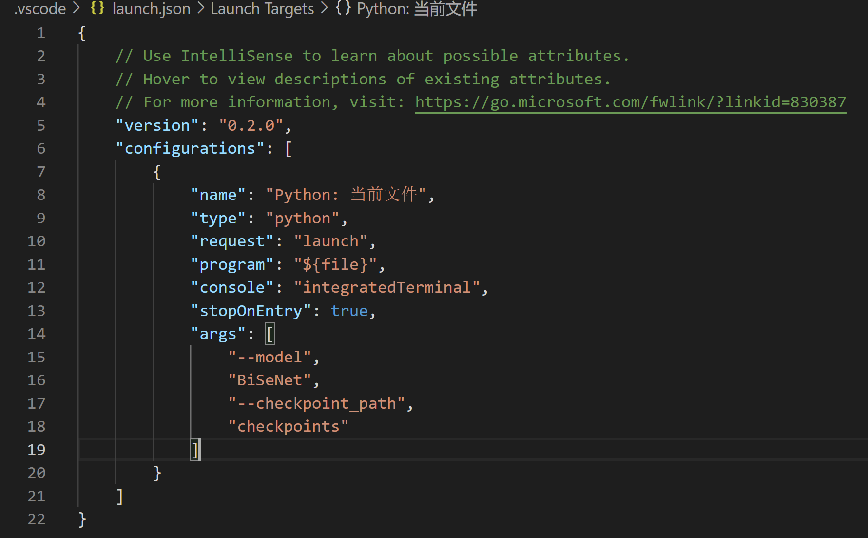 点击创建以后,在项目的根目录下会出现一个 .vscode 文件夹,里面会有一个 launch.json 文件,这个文件就是用来配置调试代码的各种选项,需要传入的参数也在这里面给出: