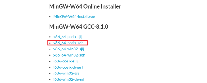 MinGW-w64离线包下载地址: https://sourceforge.net/projects/mingw-w64/files/  下载后解压到自选路径。找到下图的文件夹位置,并添加bin文件到环境变量中。 D:\software\mingw64\bin 检查安装: