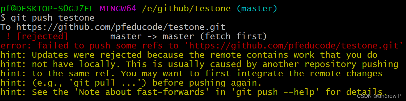 错误:无法将某些引用推送到'https://github.com/pfeducode/testone.git' 更新被拒绝,因为远程包含您在本地没有的工作。这通常是由另一个存储库推送到同一个ref引起的。在再次推送之前,您可能希望首先集成远程更改(例如,“git pull…”)。有关详细信息,请参阅“git push--help”中的“关于快进的说明”?