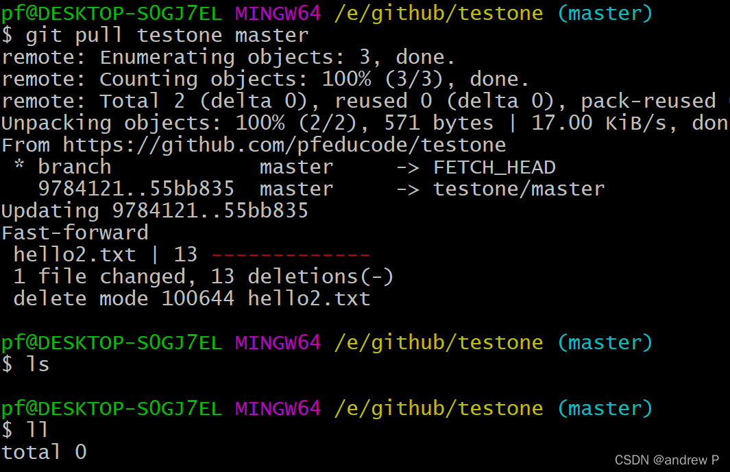 再github页面删除hello2.txt,然后使用pull命令将本地仓库和远程仓库保持一致