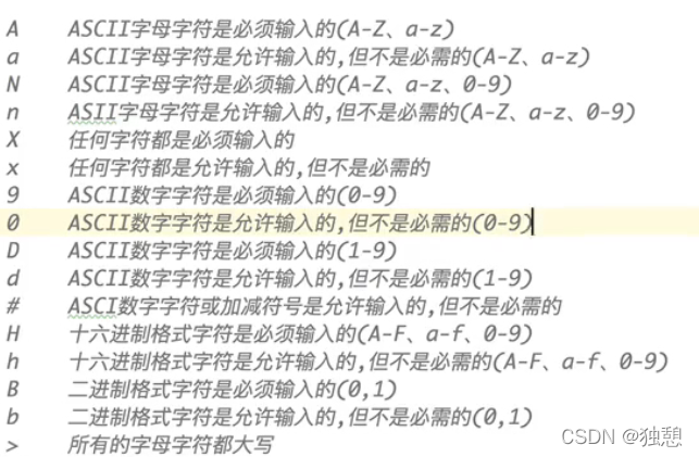 第一个部分0000.0000.0000.0000代表输入格式,这个例子就代表输入四串四个数字(0-9),同样还有: