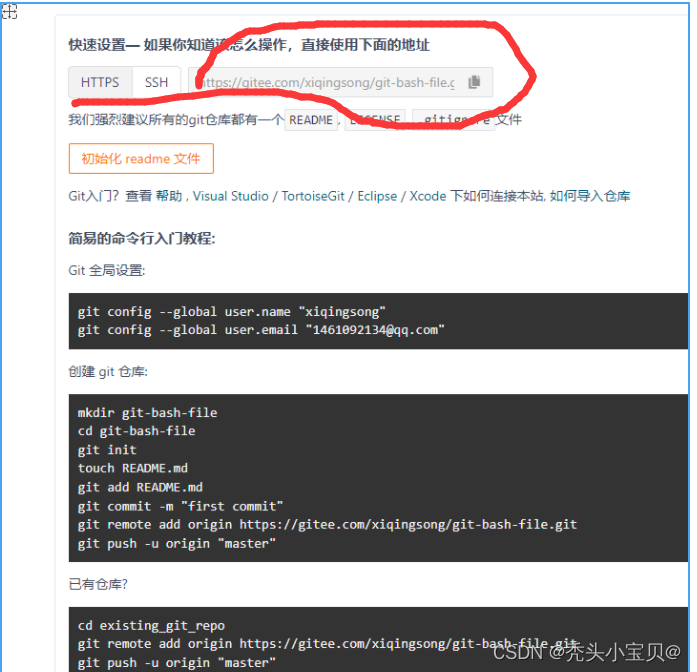 git remote add origin "https://gitee.com/***/***.git" //该连接为自己创建仓库时的地址,如下图
