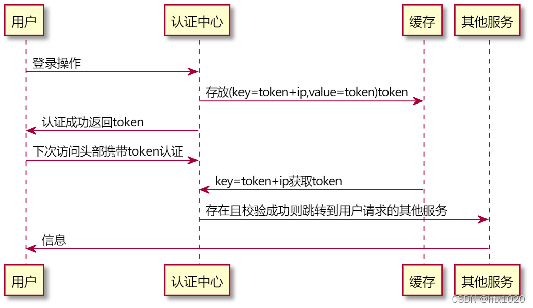 认证中心 -> 缓存: 存放(key=token+ip,value=token)token