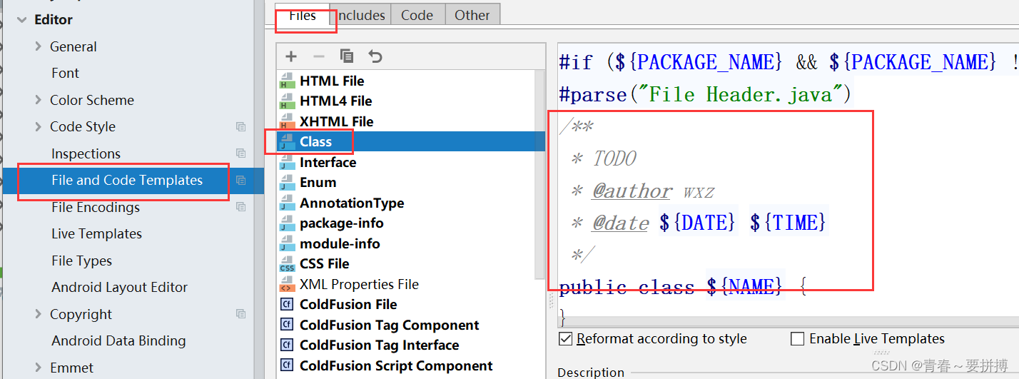 一、首先我们来设置IDEA中类的模板:(IDEA中在创建类时会自动给添加注释)1、File-->settings-->Editor-->File and Code Templates-->Files 我们选择Class文件(当然你要设置接口的还也可以选择Interface文件)