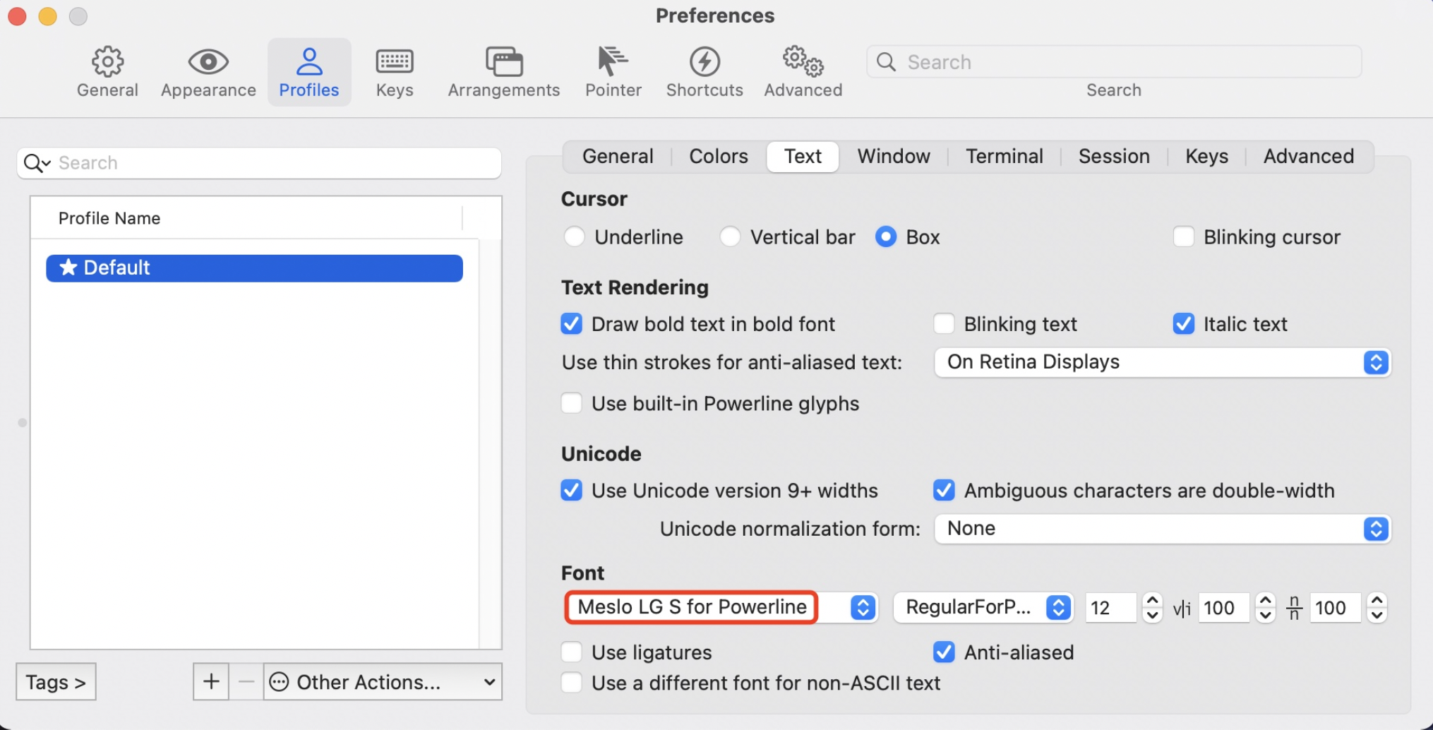 这样就安装好了字体,接下来就是设置字体,iTerm2 -> Preferences -> Profiles -> Text,设置 Font 为 “Meslo LG S Regular for Powerline”