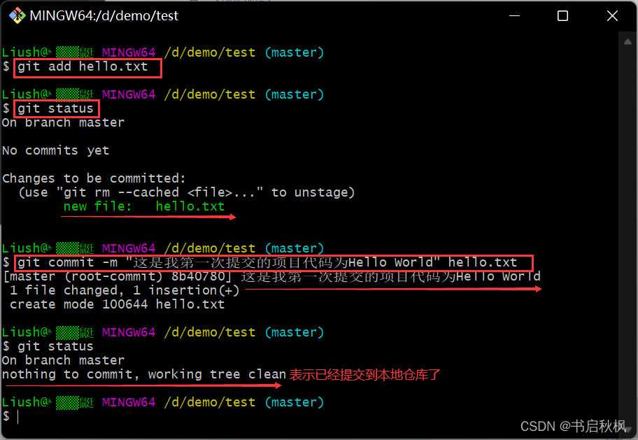 3.将暂存区中代码提交到本地仓库:git commit -m "...[自定义内容]..." hello.txt