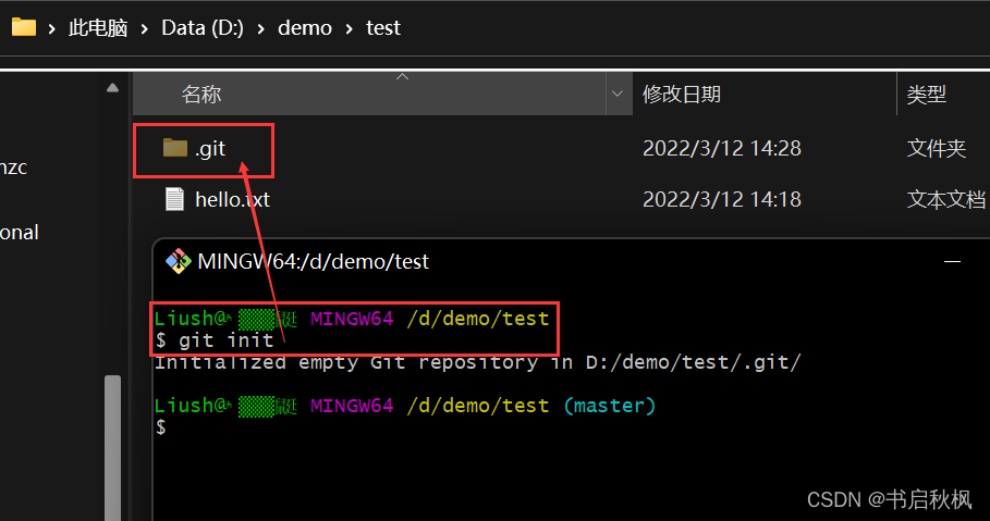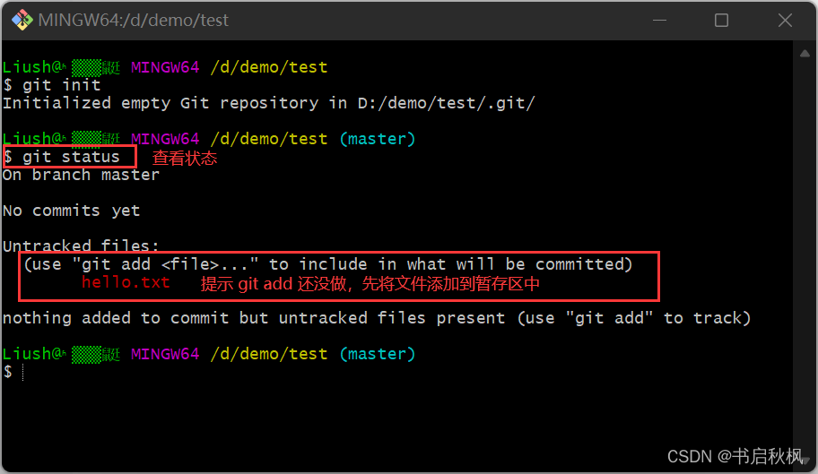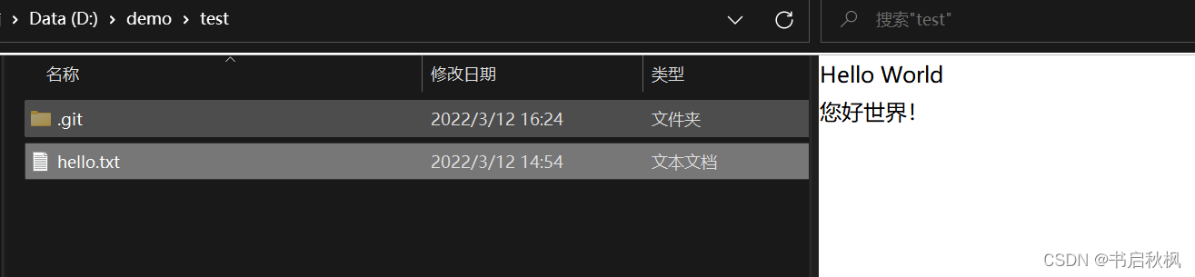 1.首先设置任意一个目录路径作为本地仓库的目录(D:\demo\test),进行初始化操作。