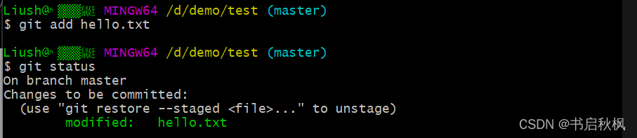 1.将工作目录中的代码提交到暂存中:git add hello.txt