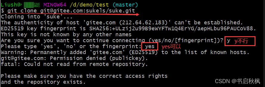 报错:敲入git push origin master后,此时报错:gitee码云push报错:git@gitee.com: Permission denied (publickey). fatal: Could not read from remote