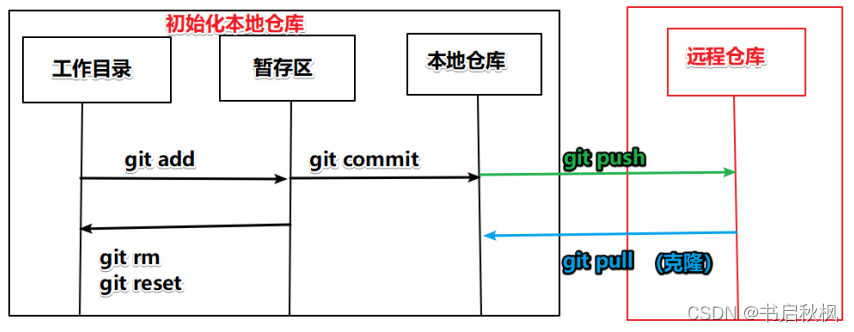 ? ? ?对应是一个本地磁盘中的一个目录,这个目录中所有的文件都被git进行管理,在以后我们的项目开发过程中代码的工作目录就是本地仓库,仓库中的每一个项目的更新或改动都是git进行跟踪的。在操作本地仓库之前必须要初始化操作(只需要初始化一次即可)