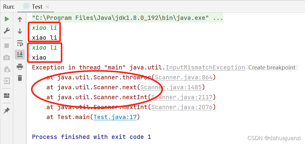 String str1=scanner.next();//遇到空格读取结束,且报错