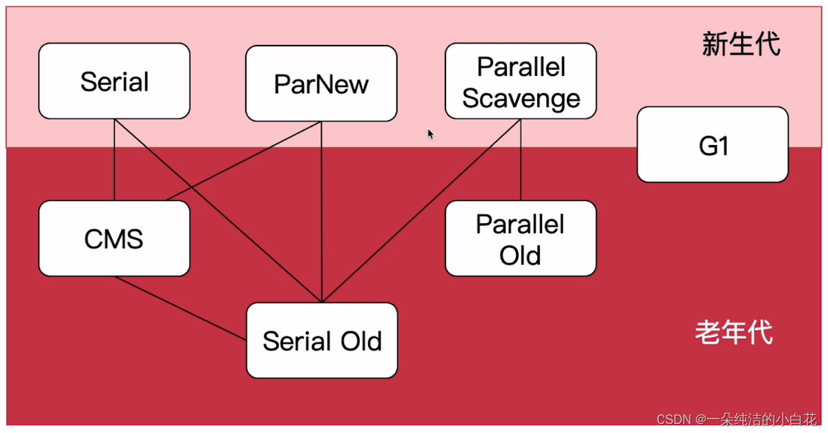 主流垃圾收集器及作用内存区域如下:(连线表示可配合使用)