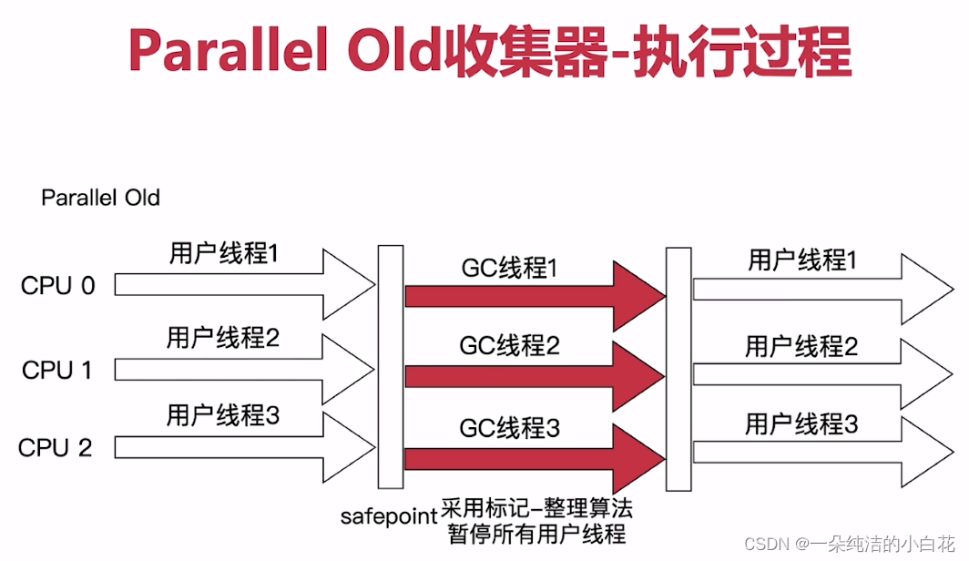 5.Parallel Old收集器:只能和Parallel Scavenge配合使用,适用关注吞吐量的场景