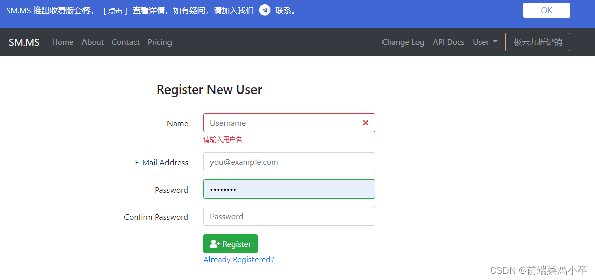 打开SM.MS官网(https://sm.ms/ ),没有账号的注册一个账号(https://sm.ms/register )。