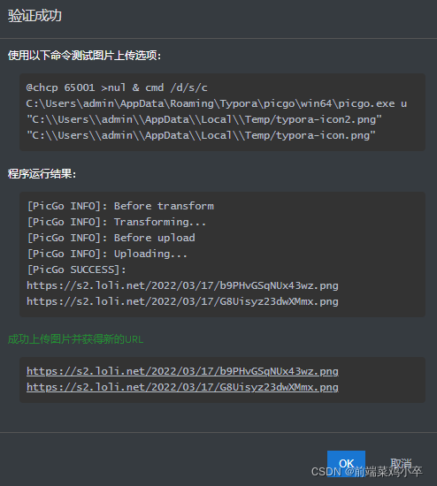 配置好,保存后,在Typora中点击验证图片上传选项 出现如下图,则说明配置成功,接下来,复制到Typora里面的图片会自动上传至图床里,此时,可以任意移动markdown文档,不用担心图片脱离本地而无法显示。