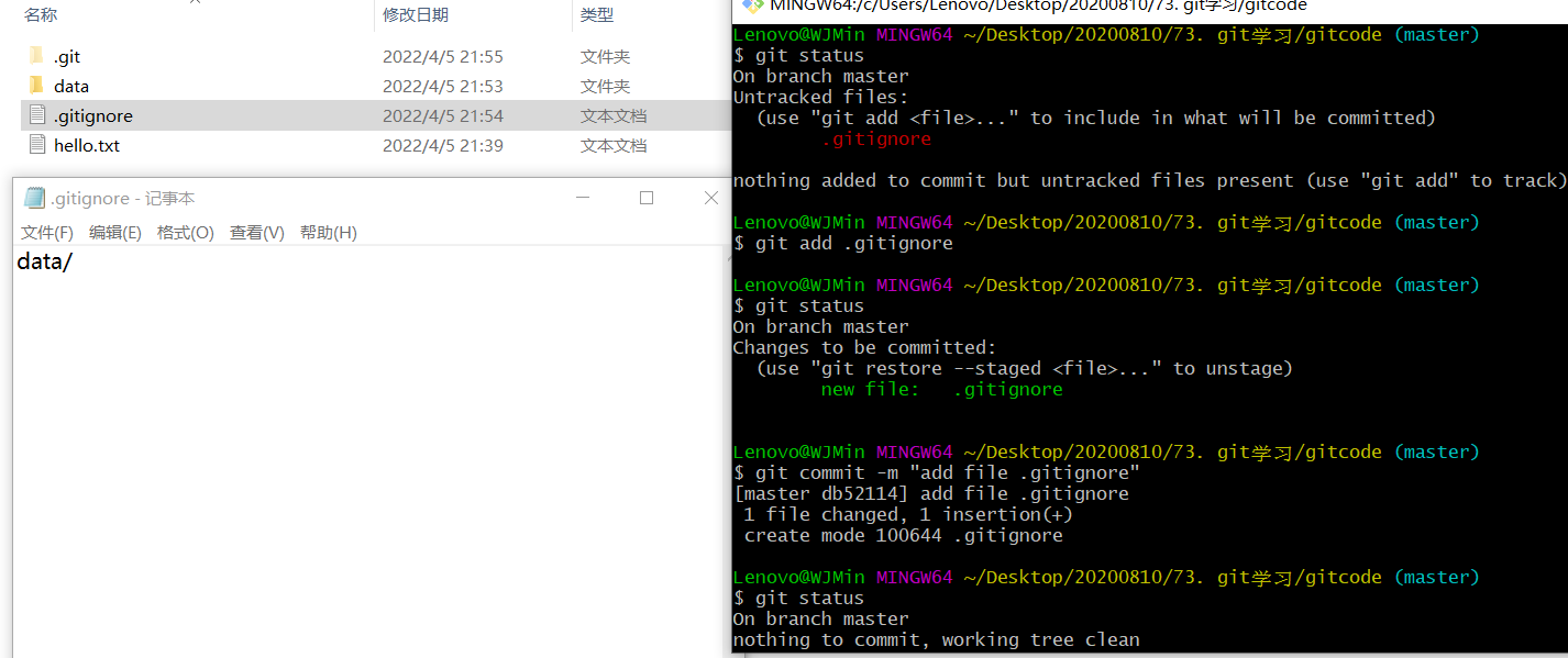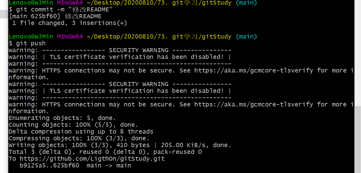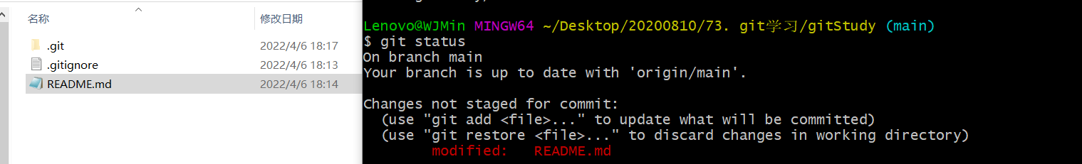 首先,更改了gitStudy中的README文件,查看文件状态,可以看到该文件状态改变  随后通过三个命令提交到远程   刷新远程目录,可以看到更改的信息