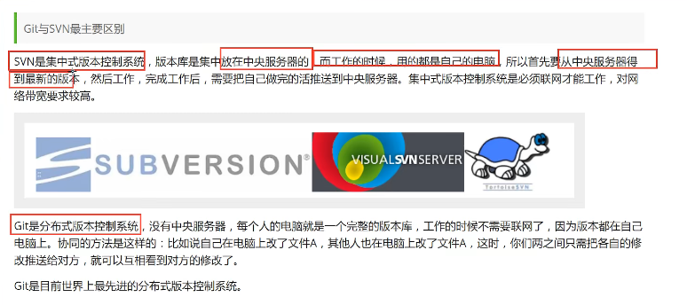 1.2 集中式版本控制 常用的如 SVN(subVersion),可用于多用户协同工作 缺陷:必须在联网的条件上使用。在使用时会有一个中央服务器,多个用户在每天工作开始时,从服务器上拉取最新的代码,晚上工作完,再将更新之后的代码推送到服务器上。 当服务器出现损坏时,将无法继续工作。 -