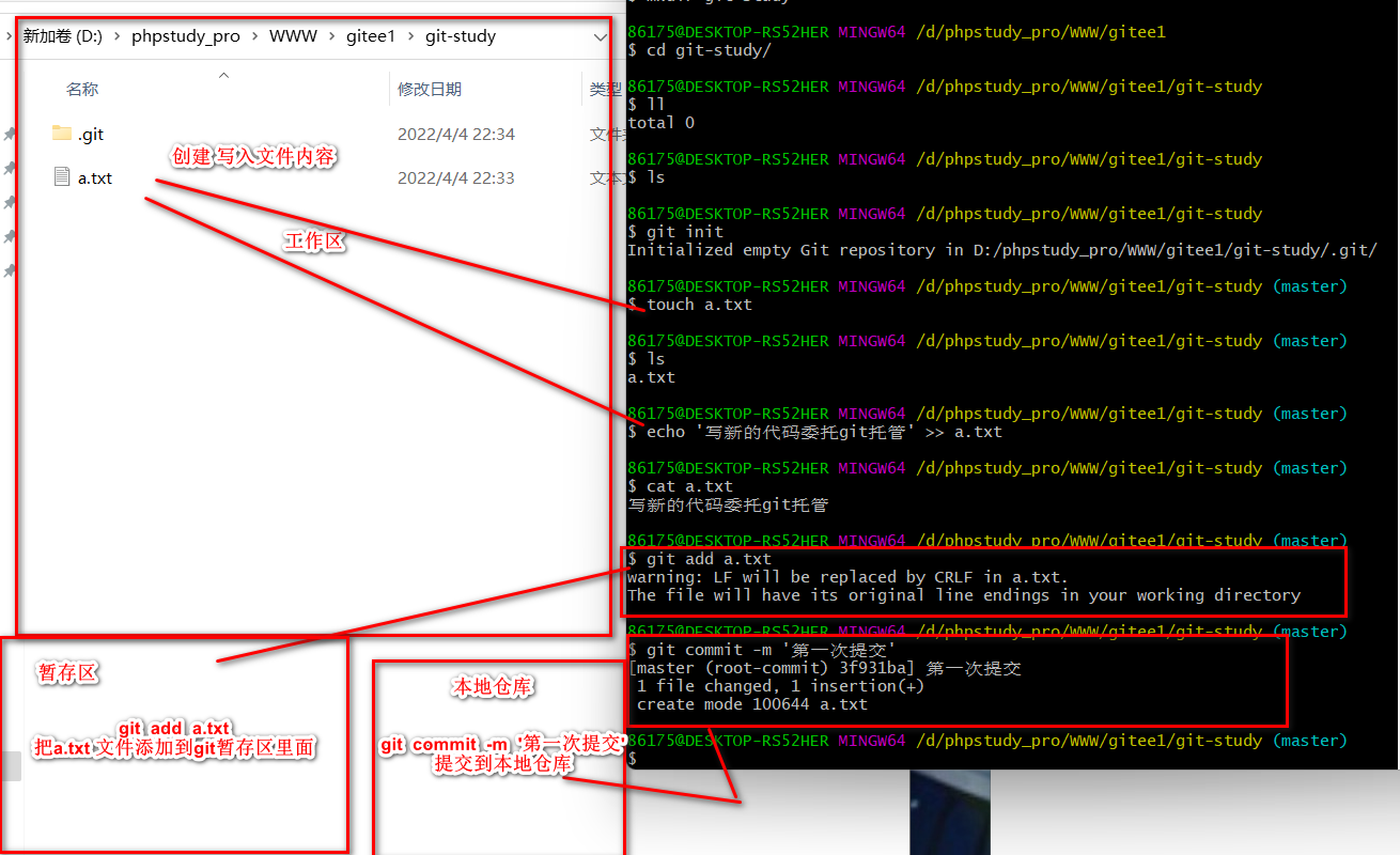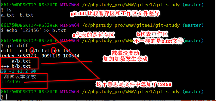 当暂存区中有文件时,git diff则比较的是,当前工作区中的文件与暂存区中的文件。