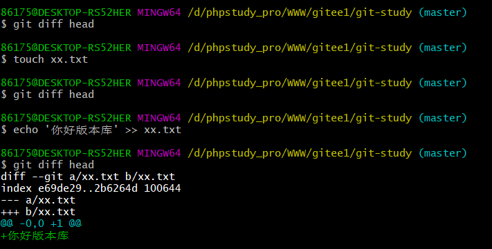 当暂存区中没有文件时,git diff比较的是,工作区中的文件与上次提交到版本库中的文件。