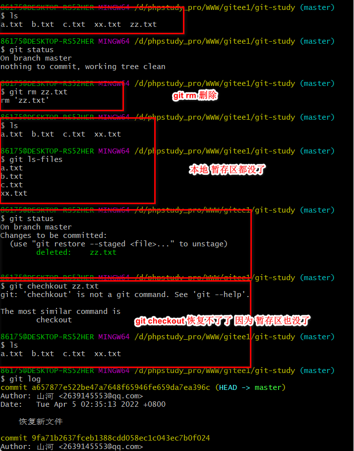 git checkout -- xx.txt 恢复工作区某个文件根据暂存区恢复的 如果暂存区没有则没有了