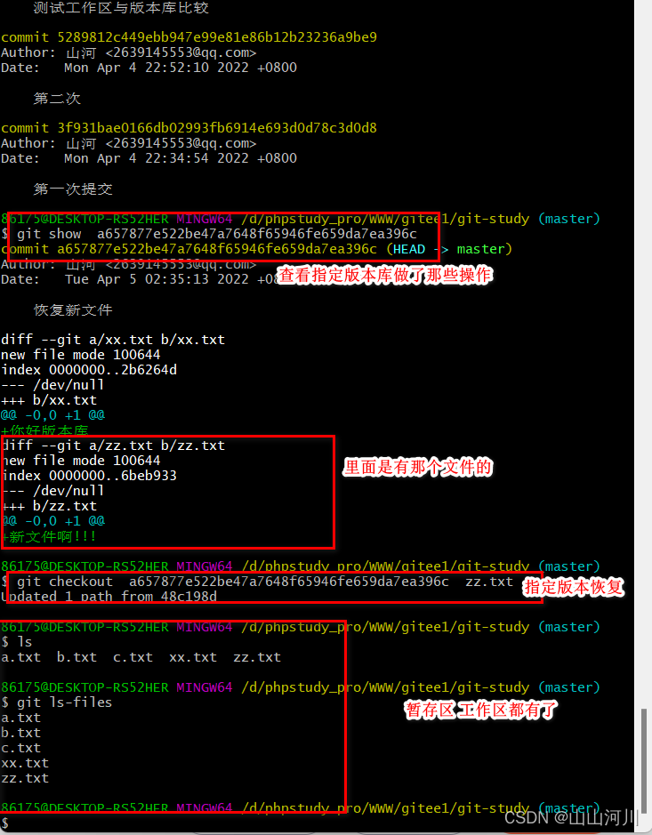 git checkout <commit> filename 将工作区指定的版本 里面的文件恢复到工作区里面