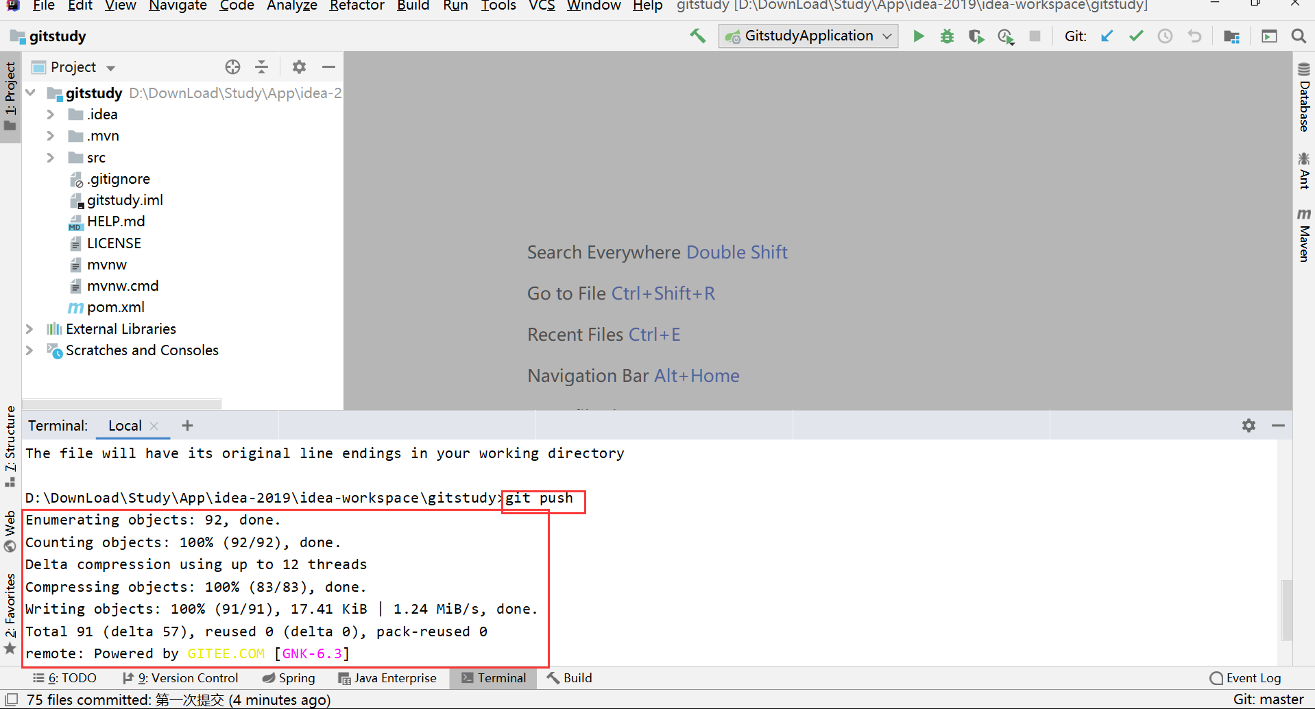 git add .:添加到暂存区  提交到本地仓库  可以使用git commit -m "xxx"进行提交,提交后可以在Version Control看到提交记录