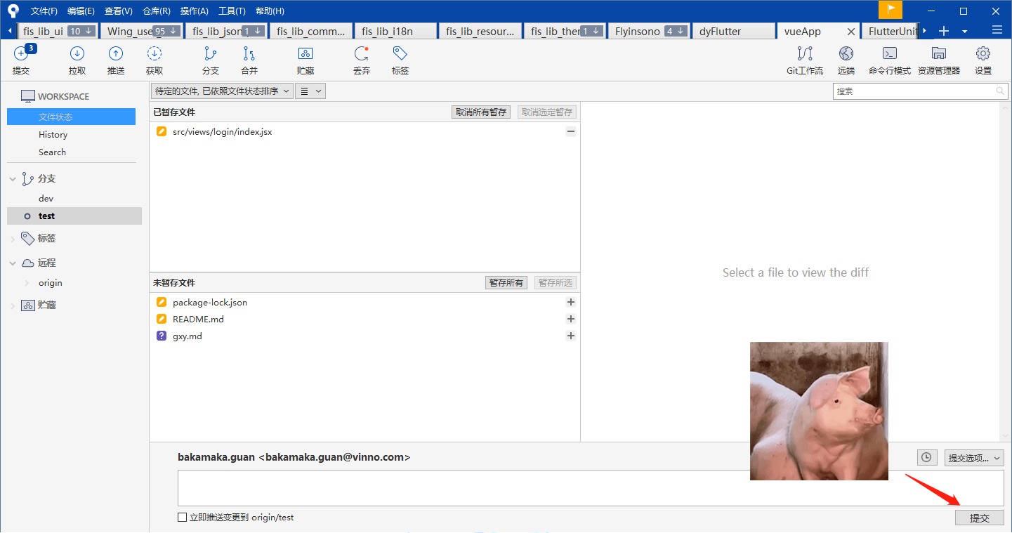 这时候大家就注意了,命令行工具是不是很简单,可是呢如果是不想要add的部分东西呢,那还得输入【git reset 文件名】撤销对于git的add操作,但是如果使用可视化工具咋样,如下面俩张图所示   点击提交,那+和-号不是很明显吗