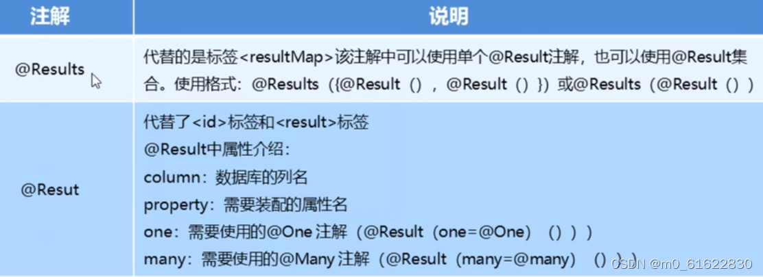 我们可以使用@Result注解、@Results注解、@One注解、@Many注解组合完成复杂关系配置