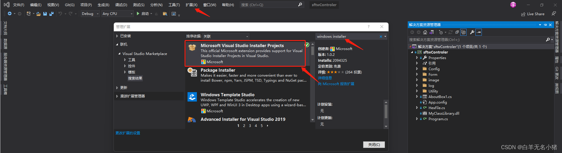 点击菜单栏上扩展->管理扩展选项,在搜索框中输入Windows installer,安装如下插件
