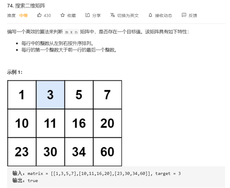 搜索的区间由一维变成了二维,但是整体上还是一个有序的,可以使用二分的做法。 思路一:先确定具体在哪一个区间里面(确定区间的过程也可以使用二分 或者暴力),然后在具体的区间里面在二分寻找值