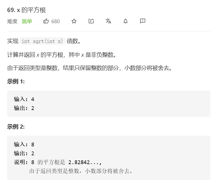 思路一 穷举 然后判断i的平方是不是等于x 但是这样的做法也有不可取的地方就是 不可以被开整数的