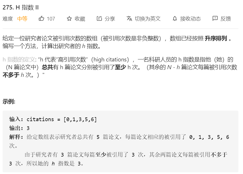 理解题意有一点点的难,但是遵从单调性的 分析单调性:整个数组的元素是代表被引用次数的大小,是遵从单调性的。 求找到的是大于等于当前数组元素的个数是和当前元素的数值相等的。很容易的一个误区会以为最后返回找到的数组元素或者论文的个数是一样的,但是其实不对!!! 对于题中给出的示例比较好理解,几个关键的用例输入的分析 如果数组中最后一个元素都是0 那么说明所有的论文都没有被引用过,所以总共有0篇论文至少被引用了0次   数组元素是100 论文个数是1 这个例子就可以很好的说退出二分循环的时候,返回的论文个数和数组元素不一定相同。 这个示例,h指数应该是1 有1篇论文被至少引用了1次