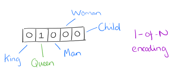 - 比如下面5个词组成词汇表,词"Queen"的序号为2, 那么它的词向量就是(0,1,0,0,0)同样的道理,词"Woman"的词向量就是(0,0,0,1,0)。