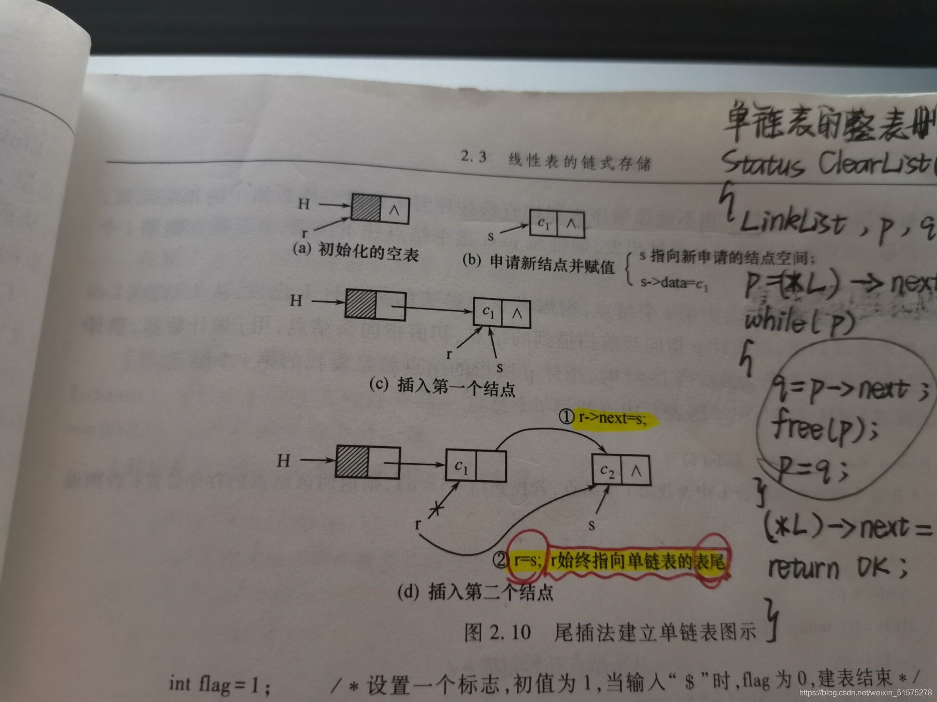 ?? ?while(flag)//循环输入表中元素值,将建立的新结点s插入表尾