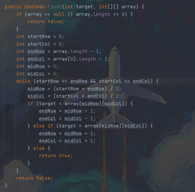 2 半暴力 + 二分查找:可以一个循环来遍历行,而在此循环内,进行本行中目标值的二分查找,时间复杂度为 O(nlogn) 实现如下: