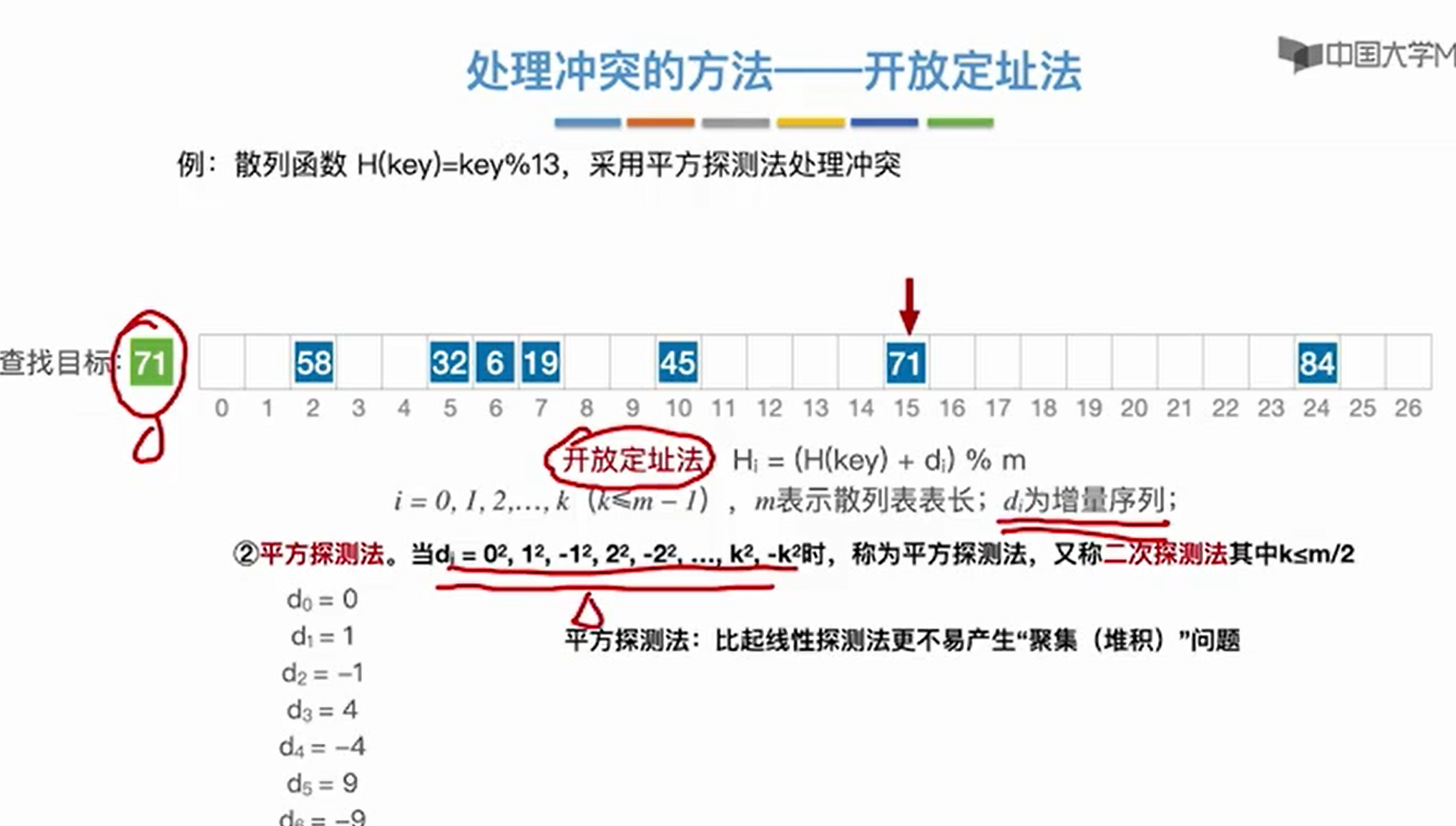 查找71,先比较6这个位置,其次19,32,45,58,71  8不满足4j+3,所以不能探测所有