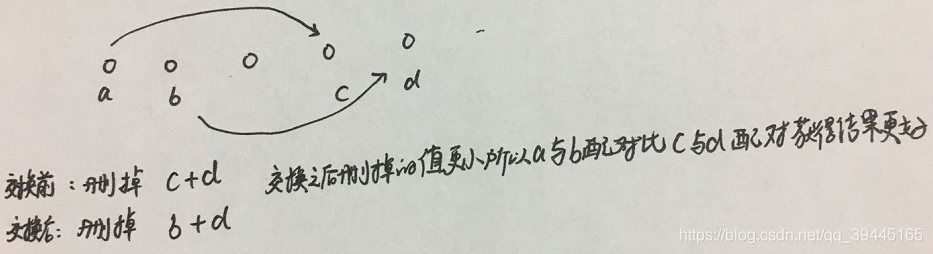 因为数组中的元素在配对的时候与在数组中的顺序是没有关系的,所以我们可以先对数组排个序这样可以找一下规律,排序之后依次考虑配对的顺序,我们可以先考虑前面两个较小的数字看一下他们的配对顺序,可以发现较小的两个数字配对之后删除元素的总和是更小的,也即剩下来的元素总和是更大的,因为如果一开始a不与b配对,与其他的数字配对那么经过交换配对的顺序之后可以发现交换之后删除的元素总和是更小的,也即剩下来的结果是更大的,所以较小的两个数字配对的结果是更优的,同理我们依次可以得到剩余的数字也是相邻两个较小的数字配对能够获得更优的结果,所以我们对nums排序之后依次取较小的那个值累加起来即可。