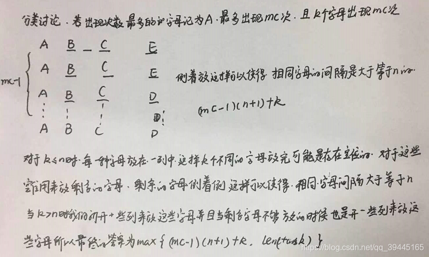 这道题目还是挺有难度的,思路比较难想。在力扣官方的题解中使用的是构造的方法,先统计一下出现次数最多次数的字母,设出现次数最多的字母有k个,分别为A,B,C,D...,最大次数为maxc,当k <= n的时候我们需要将这些相同的一列字母排成一列,这样这些字母就有maxc行,并且每一行的有n个空位,这些空位首先是安排这些出现次数最多的字母,然后放剩余的出现次数小于maxc的字母,对于剩余的字母我们是倒着放的,这样对于相同的字母间隔的数目一定是大于等于n的满足题目的要求,上面放所有的字母的时候是有空位的,所以还存在其余的两种情况分别为为k > n和剩余的字母无法放到空位上了,那么我们就需要开另外的列来放这些字母,并且也是倒着放的,这样就一定可以满足相同的字母的间隔是一定大于等于n的,并且可以发现最终的答案一定是max{(maxc - 1) * (n + 1) + k, len(task)}。