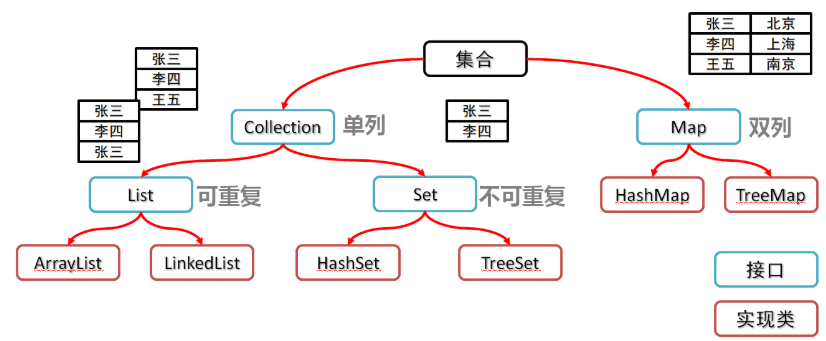 Map 集合概述: (双列集合) ? ? ? ? Interface Map<K,V>? 键值对 ? ? ? ? 键不能重复,值可以重复 ? ? ? ? 键值是一一对应的,每个键只能找到自己对应的值 ? ? ? ? (键 + 值) 这个整体我们称之为“键值对” 或者“键值对对象” ,再Java中叫做“Entry对象”