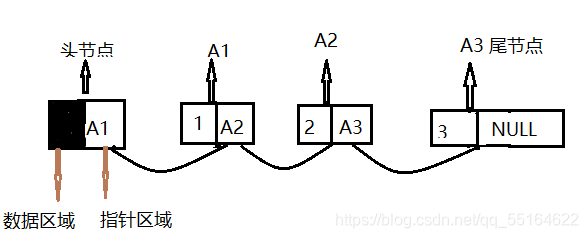 单链表由头节点,尾节点和中间的多个节点组成,每个节点由两中数据组成,一个为数据区域另一个为指针区域,数据区域用来保存存入的数据,指针区域用来保存下一个节点的地址,从而将多个节点连接成完整的链条(一环扣一环),头节点的数据区域不用存入数据,将最后一个节点的指针区域定义为空(NULL),以此作为最后一个节点。
