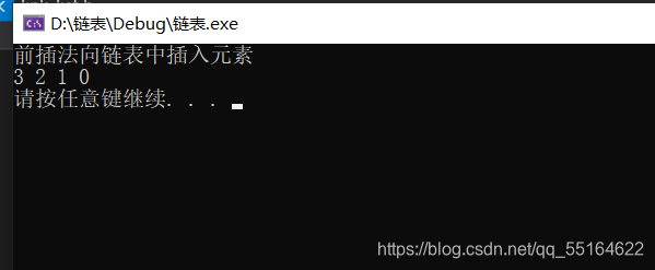 向链表中插入的元素是0,1,2,3,输出的时候是反向输出说明代码运行结果是对的因为(例如:插入 1 以后?在插入 2 ,1 就必须往后面移动)所以输出的时候是 3,2,1,0。