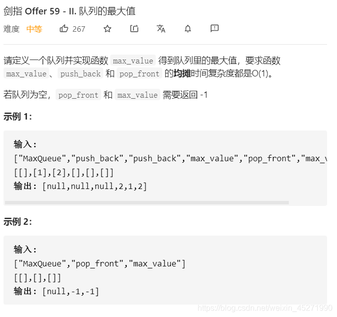 当执行入队 push_back() 时: 若入队一个比队列某些元素更大的数字 xx ,则为了保持此列表递减,需要将双向队列 尾部所有小于 xx 的元素 弹出。 当执行出队 pop_front() 时: 若出队的元素是最大元素,则 双向队列 需要同时 将首元素出队 ,以保持队列和双向队列的元素一致性。