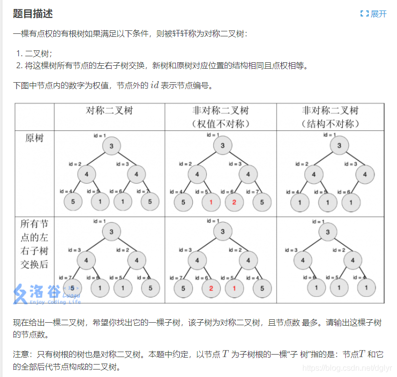 对于每个左儿子右儿子,每次递归左儿子的左儿子,右儿子的右儿子;左儿子的右儿子,右儿子的左儿子。 如果两个都是-1,那么贡献为0,但还是有对称性。 然后从结构,权值两个来判断对称性,每一对的贡献都是2,否则整棵树都不对称,标记一下并返回。 最后把所有有答案的树求max