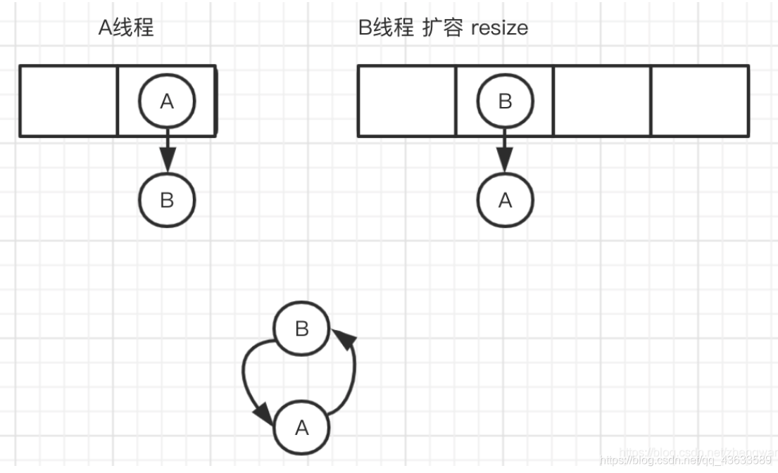 ? 因为1.7头插法扩容时,头插法会使链表发生反转,多线程环境下会产生环;A线程在插入节点B,B线程也在插入,遇到容量不够开始扩容,重新hash,放置元素,采用头插法,后遍历到的B节点放入了头部,这样形成了环,如下图所示:
