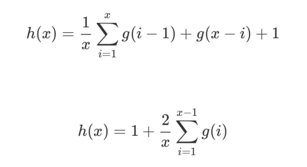 分析:先算长度为x时两端有人期望坐下的人数f(x),再算长度为x时一端有人期望坐下的人数g(x),因为是高情商坐法,实际上在任意一端有人时都只有一种坐法(离最近的人最远),故递推可得对f(x)与g(x)当x确定时函数值也唯一确定。最后设h(x)为长度为x的板凳期望坐下的人数(坐哪都相当于两个一端有人的g(x)),且第一个人的坐法是等概率的,故最后对g(x)算个前缀和,每次直接查询期望就好了。