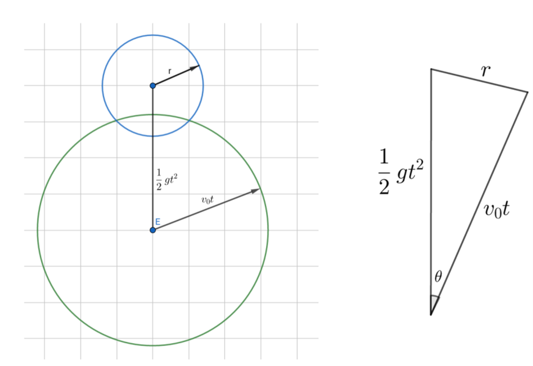 分析:考虑转换参考系,给人和手榴弹都加一个反向重力,于是人往上做匀加速直线运动,手榴弹往v方向做匀速直线运动,易求得人和手榴弹最后的位置,于是两球半径和球心距都已知,问题转化为两球相切表面积问题。不会戳这里?球缺体积和球冠表面积的计算公式及应用,算出来的球冠表面积可由余弦定理算出的cosθ表示为2π(vt)^2(1-cosθ),球的表面积公式为4π(vt)^2,故死亡率为(1-cosθ)/2,生存率为(1+cosθ)/2。