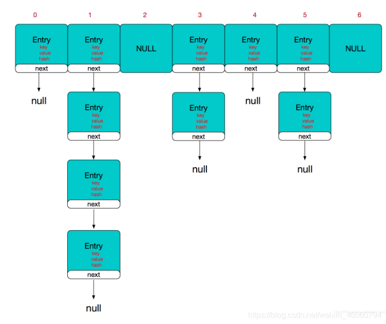 HashMap采用Entry数组来存储key-value对,每一个键值对组成了一个Entry实体,Entry类实际上是一个单向的链表结构,Entry的属性包括:key、value、hash值和指向下一个Entry对象的next指针。链表是用来解决Hash冲突(碰撞)。Hash冲突(碰撞):当我们对某个元素进行哈希运算,得到一个存储地址,然后要进行插入的时候,发现已经被其他元素占用了,无法直接插入。