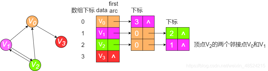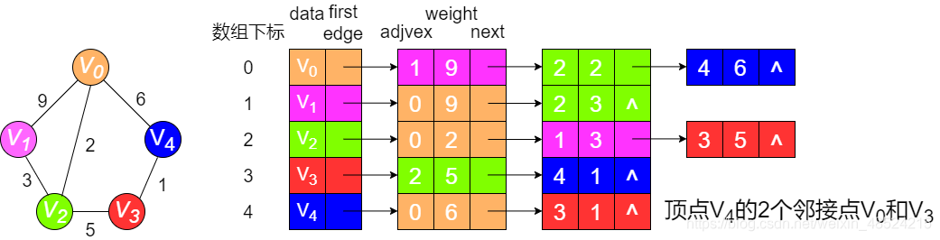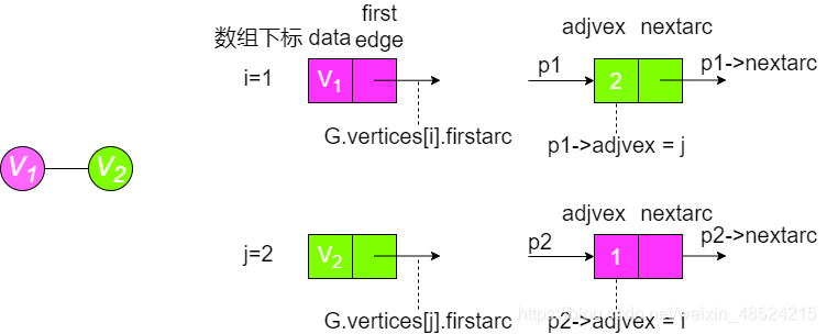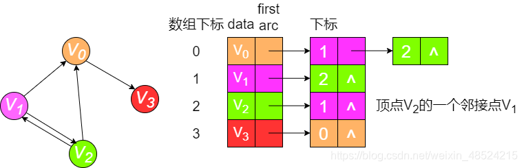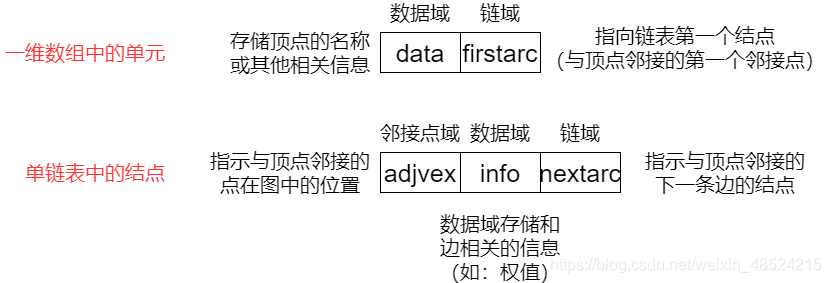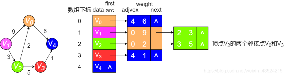 一维数组存储顶点和和其第一个邻接点的指针 单链表存储顶点的所有邻接点 arc:弧(有向图中的边) edge:边(无向图中的边) vertex:顶点 adjacent:邻接  图的邻接表存储表示